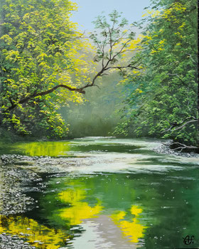 Ein sehr heißer Sommertag am Fluss. Lauer Sommerwind und das sanft dahinfließendes Wasser lädt dazu ein, die Füße im Fluss abzukühlen und den Geräuschen des Waldes zu lauschen.