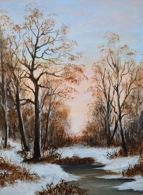 Dieses kleine, feine, handgemalte Ölbild - Unikat beschreibt einen winterlichen Wald. Seine Einsamkeit, Stille und Schönheit sind wunderschön.